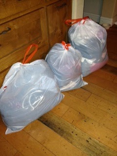 No, this isn't the stack of garbage outside my back door, the result of forgetting to put the bin out to the curb. THIS is a stack of clothes I haven't worn in probably 4 years. They say if you haven't put it on in TWO years, it's time to get rid of it. Since I'm always on a cleaning mission when I'm home, I decided the closets would be this week's target. The good news is that I always get a receipt so it can be deducted from my taxes!!