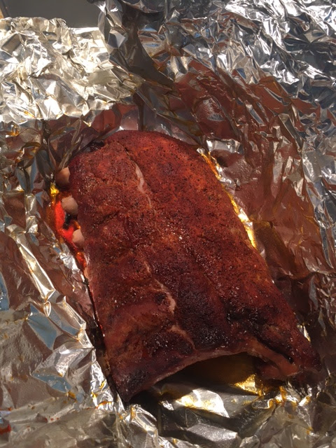 Two full hours of smoke at 225, wrap them in foil and back in they go for another hour to cook. If you want them saucy, take them out, sauce them up and back in the smoker they go for 30-60 minutes more. I just left them in, to sauce when I eat. Really, these are so good you can do without the sauce.