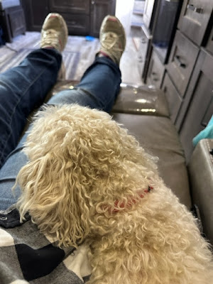 We were all exhausted from fabric shopping, so we lounged around in their living room for awhile. I was graced by the presence of Miss Penny. She is definitely a lap pup!