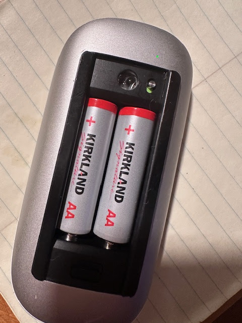 It started out with these Kirkland (Costco) batteries. Don't buy these. I put them in my computer mouse a short week ago and they are already dead. I usually buy Duracell which last for a LONG time. They didn't have any this last trip, so I got the cheapies. I won't be doing that again! By the way Terry ... it's still working just fine!!!